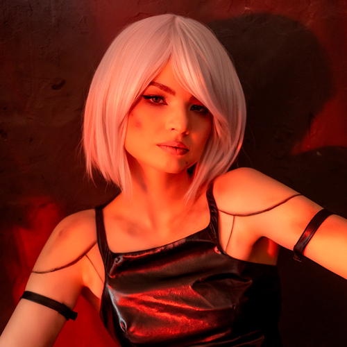 Bayonetta cosplay – poised stance under orange light, high ponytail & glasses