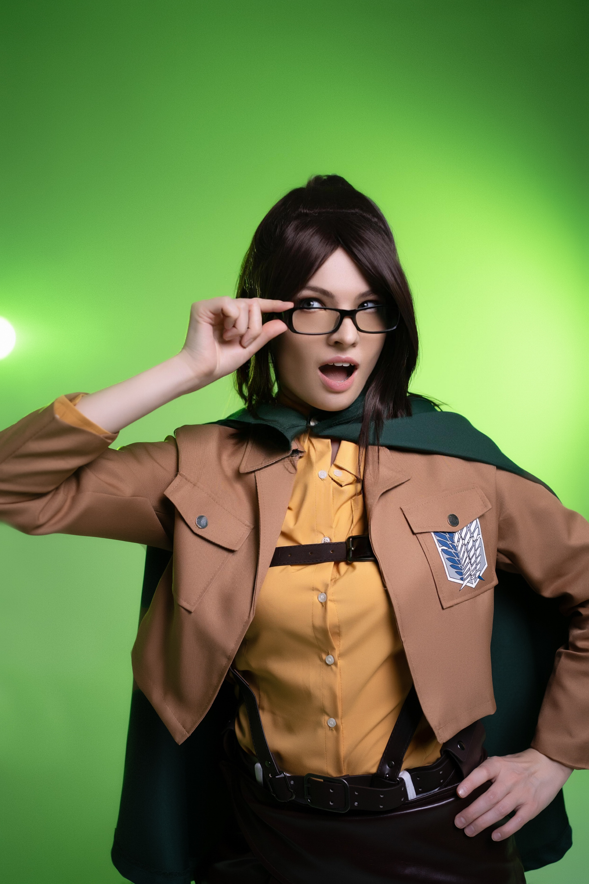 Hanji Zoe AOT cosplay – playful glasses lift, bright green background